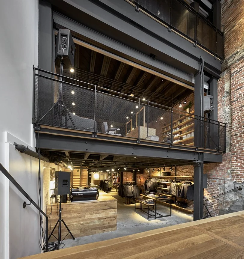 The new Frank & Oak flagship store, located in downtown Montreal, establishes a strong connection to its surroundings as the retail space links directly with the urban environment. Occupying 5,200 ft2 on three levels of an existing building, the architectural transformation uses the verticality of the new open atrium to unify and give coherence to the space's multiple functions. The store seeks to offer a space for meeting and exchange, housing a clothing boutique, a barbershop and a café.