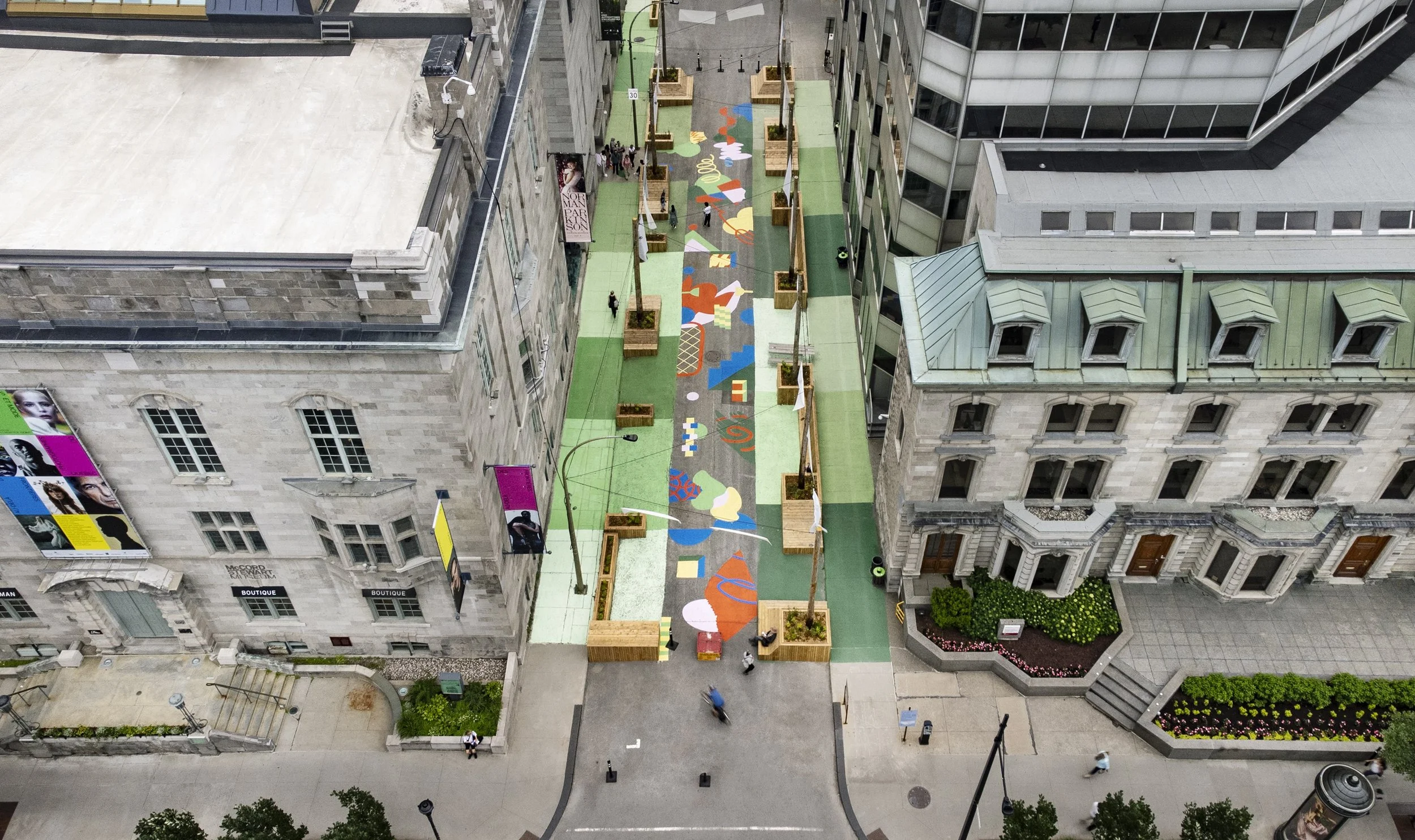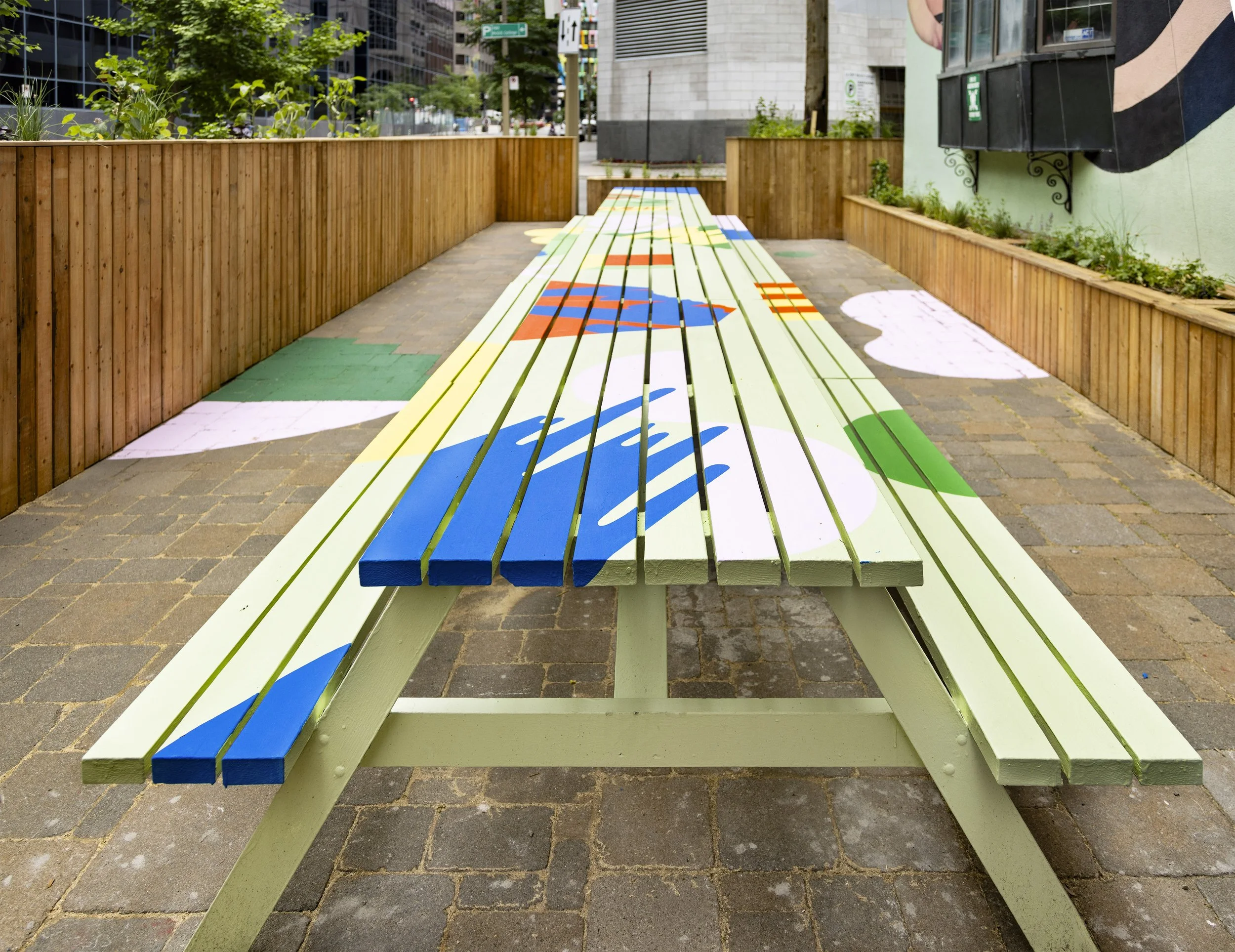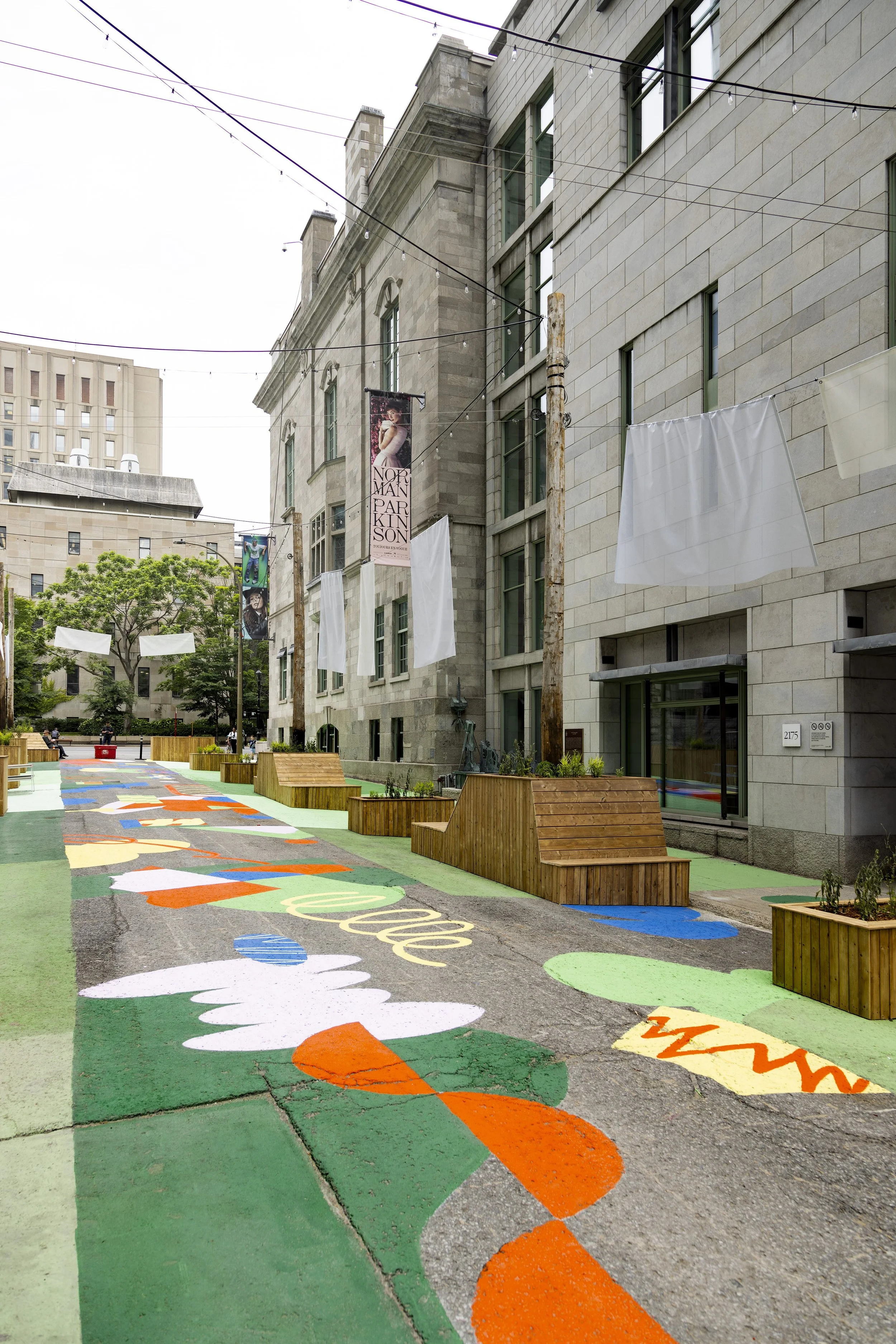 Au sol, entre les lots de verts qui illustrent le lotissement des terrains montréalais, une œuvre réalisée par Olivier Charland dans le cadre du festival MURAL évoque la vivacité des ruelles, en capturant l’énergie et le mouvement des instants du quotidien à travers des formes abstraites.